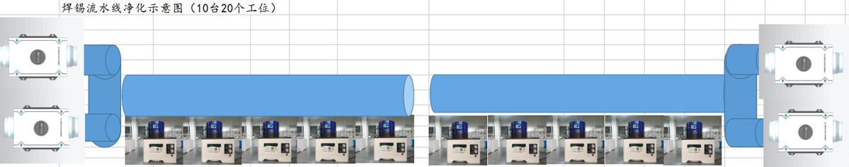 Smoke generated by soldering tin is collected through the hose of "equipment oil fume odor purifier" and ionized and decomposed into carbon dioxide by electrostatic high voltage electric field after primary filtration. Smoke and harmful gases are filtered through advanced filter through pipeline and discharged into the floor through fresh air fan.